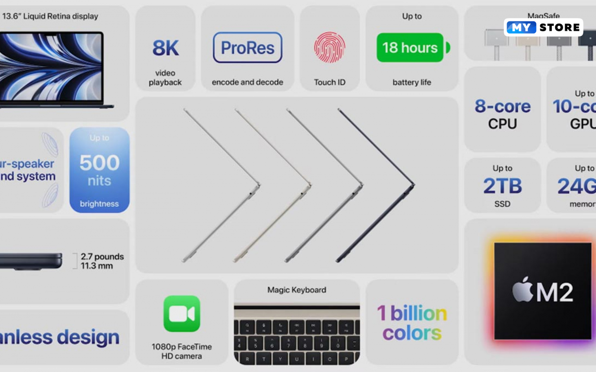 Еще один важный этап презентации – новый компьютер, оснащенный процессором AppleM2. Этим девайсом стал MacBook Air 2022. Разработчики уделили достаточное внимание «внутренностям» устройства. Что добавилось или изменилось: