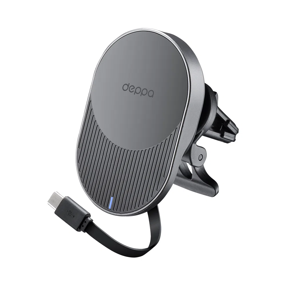 Мощный магнитный держатель с функцией беспроводной зарядки Deppa Magic Cable позволит вам удобно и надежно зафиксировать ваш смартфон. Если вам потребуется перевернуть телефон, вы сможете это сделать одним легким движением руки. Держатель оснащен длинным встроенным кабелем Type-C длиной 77 см, который можно будет подключить туда, куда вам будет удобнее всего. Беспроводная зарядка мощностью до 15Вт зарядит ваш смартфон быстро и безопасно, а LED-индикатор всегда сообщит вам о подключении зарядки к сети. Удобное и надежное крепление-прищепка легко фиксируется практически на любой вентиляционной решетке.