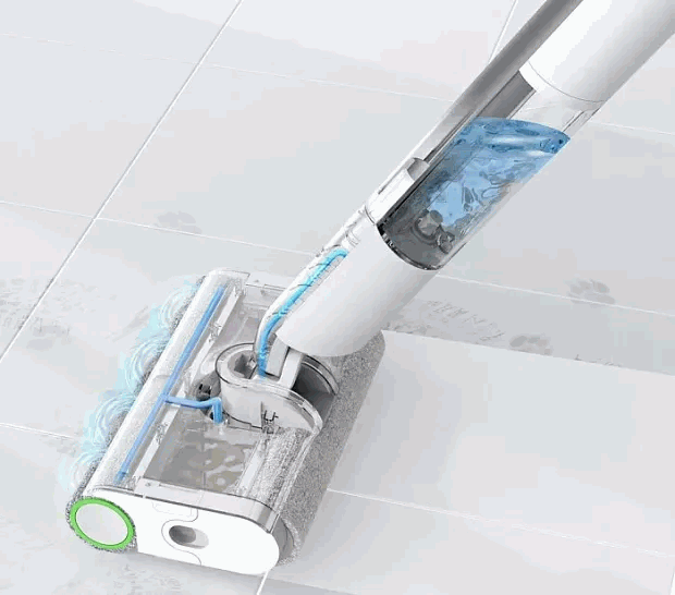 В процессе уборки роликовые щетки автоматически ополаскиваются чистой водой, а стекающая грязная вода очищается. Также после завершения уборки установите швабру на зарядную станцию, чтобы она самостоятельно очистила щетку.