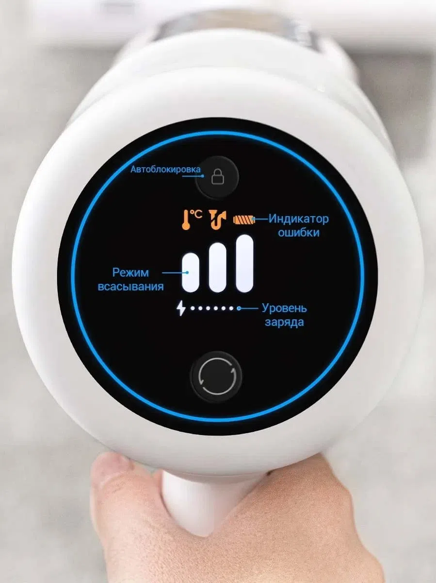 Вся необходимая информация наглядно выводится на экран, расположенный в торце пылесоса. Выбранная мощность, уровень зарядки и возникающие ошибки выводятся на дисплей. При помощи сенсорных кнопок вы можете включить блокировку или изменить режим уборки.