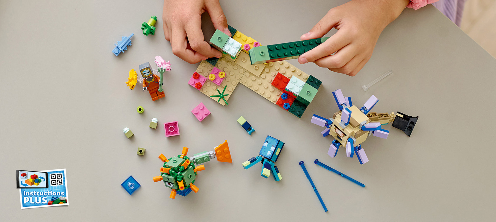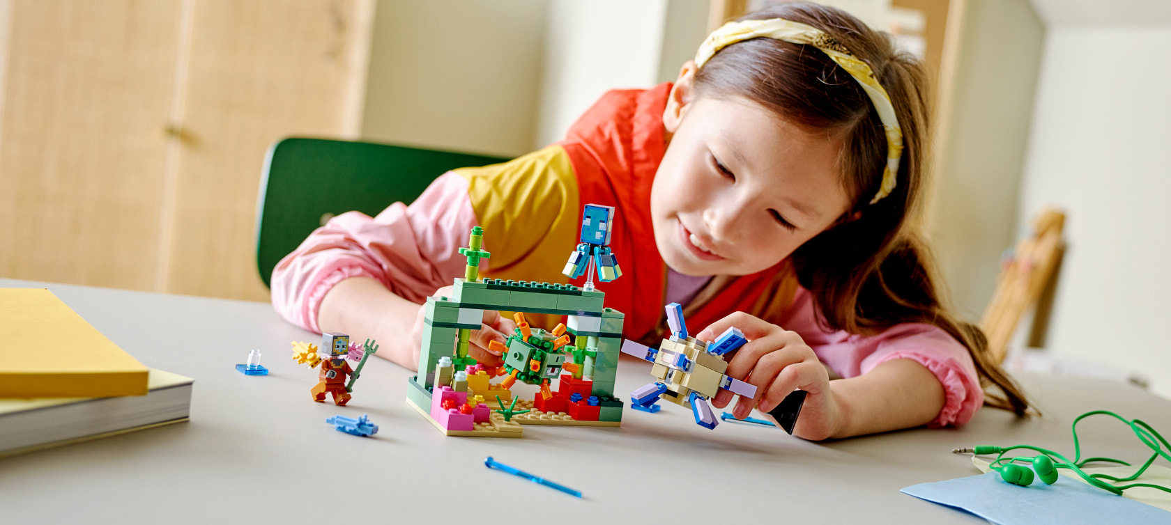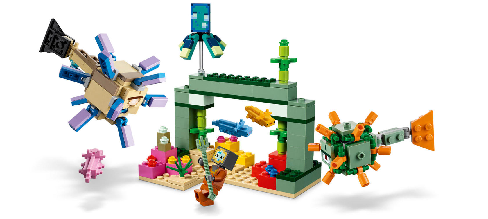 Набор LEGO® Minecraft® «Битва со стражем» отправляет игроков в миссию на дне океана со знакомыми персонажами из популярной игры.