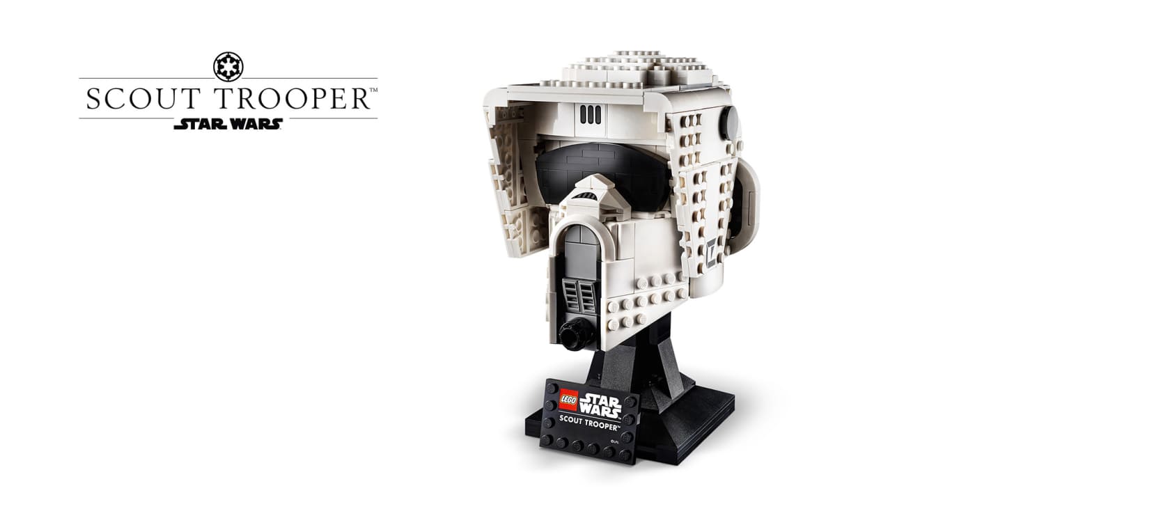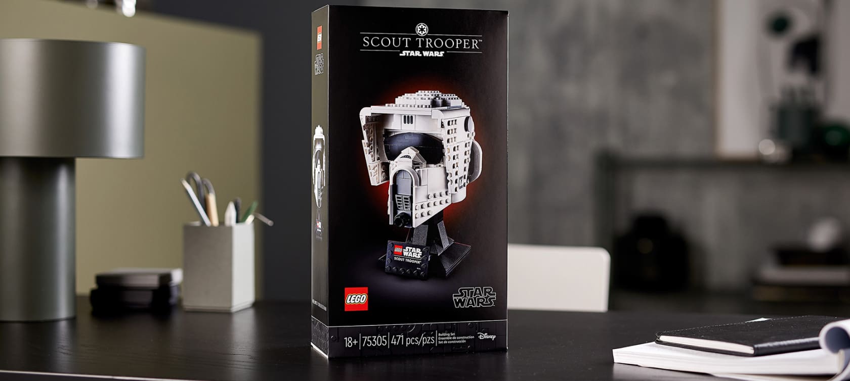 Этот шлем штурмовика-разведчика с подставкой для демонстрации, состоящий из 471 детали, имеет высоту более 18 см.
