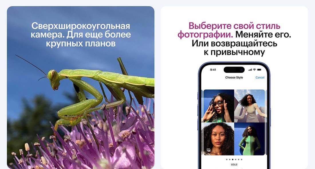 Основная камера с разрешением 48 Мп и диафрагмой f/1,6 обеспечивает 2-кратный оптический зум без потери качества. Сверхширокоугольный модуль на 12 Мп также поддерживает режим макросъёмки. Снимки и видео, сделанные с помощью этих камер, можно просматривать на гарнитуре смешанной реальности Vision Pro.