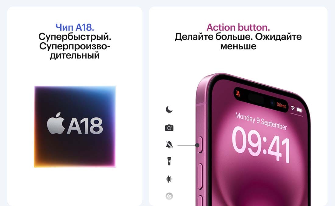 В iPhone 16 установлен новый процессор A18, позволяющий играть в сложные компьютерные игры, такие как Resident Evil 7 и Assassin’s Creed: Mirage. Благодаря аппаратной поддержке трассировки лучей, освещение в играх становится ещё более реалистичным. По словам производителя, энергоэффективность процессора увеличилась на 30% по сравнению с предыдущей моделью. Смартфон будет поддерживать все функции искусственного интеллекта Apple Intelligence, который станет доступен вместе с iOS 18.